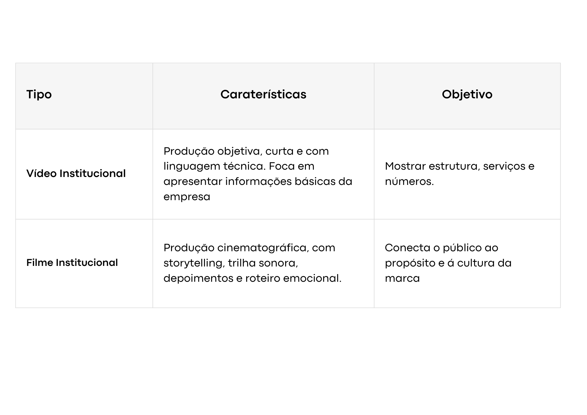 Ou seja, enquanto o vídeo institucional cumpre um papel informativo, o filme institucional vai além da forma: ele inspira, emociona e permanece na memória.